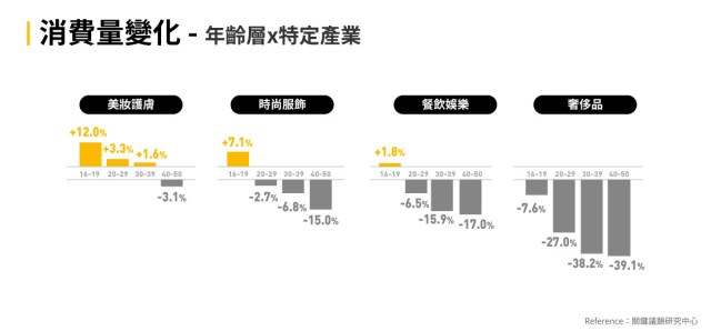 | 疫情期間年齡層 x 特定產業的消費量變化 (圖片來源: 關鍵議題研究中心 ) |