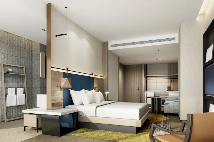 | 一般房型(或標準客房)的設計構想圖,從房門口往內看 (圖片來源: 希爾頓官網 ) |