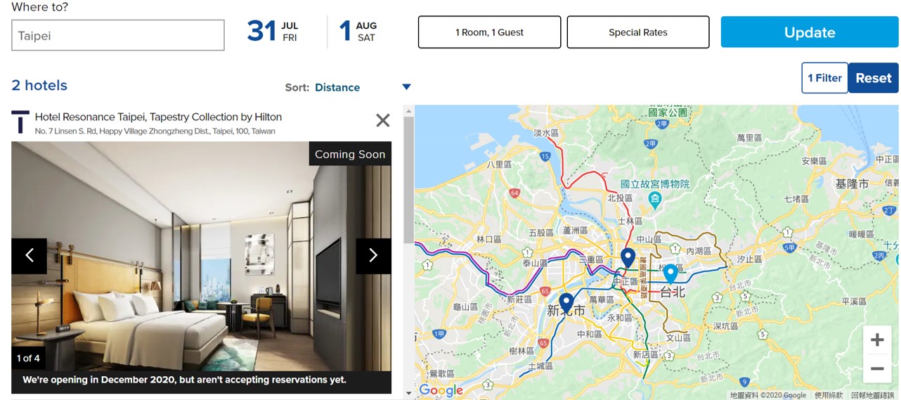 本篇是繼2019年1月「台北W酒店的成功 太子建設積極作為的下一步」,11月「業主搶第一 亞太區首發 希爾頓TAPESTRY COLLECTION精選系列酒店2020年進駐台北市」,12月「[更新版] 亞太區首發 希爾頓TAPESTRY精選系列– THE RESONANCE TAIPEI 2020年底現身」之後的文章資訊更新。對於希爾頓Tapestry 精選系列之「台北時代寓所(Hotel Resonance Taipei)」已於近日在集團官網上現蹤 (記得要把篩選條件勾除「可預訂的酒店」),並標註今年12月開幕,加上酒店早已在召募工作團隊以及剩下約莫半年的籌備時間,基本上是可以在今年年底前期待它的正式開幕(→另一間也在忠孝東路上的台北宏普三井花園酒店忠孝新生館,預計也會在年底前開幕)。