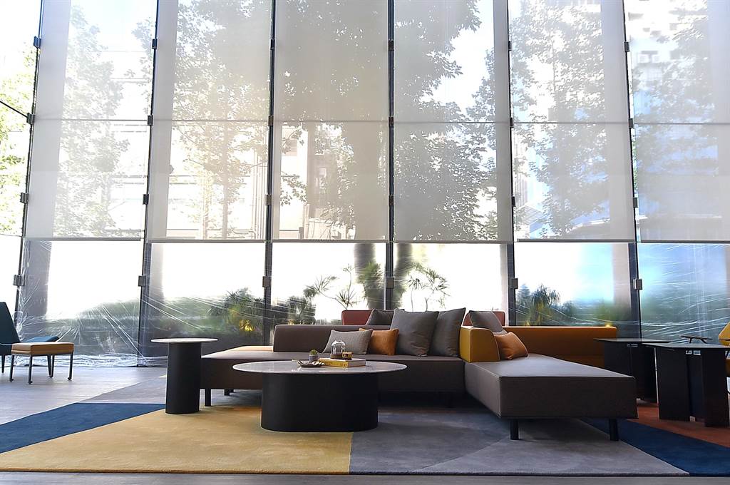 〈台北時代寓所〉大廳以大片落地玻璃將室外的景觀公園,以及室內台北旅人們溫暖的家連結,窗明几淨、光線穿透,將自然與人造的完美揉合。(圖/姚舜)* |