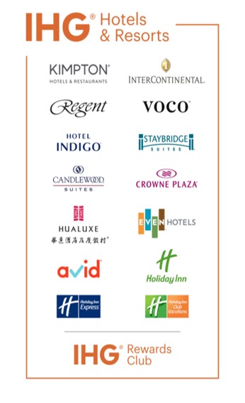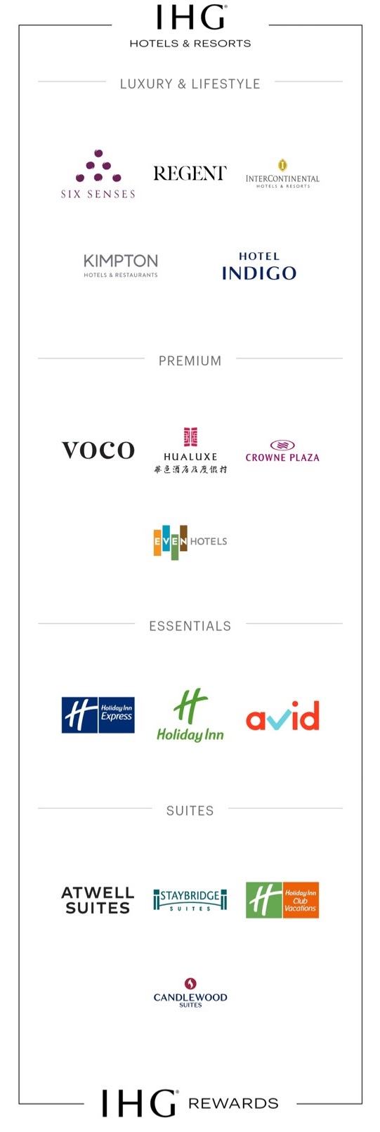 - 酒店與度假村品牌家族:集團英文徽標由 IHG 演變為 IHG Hotels & Resorts,於註冊商標名之後增加了Hotels & Resorts描述詞,以強調集團旗下並駕齊驅的16個酒店及度假村品牌。