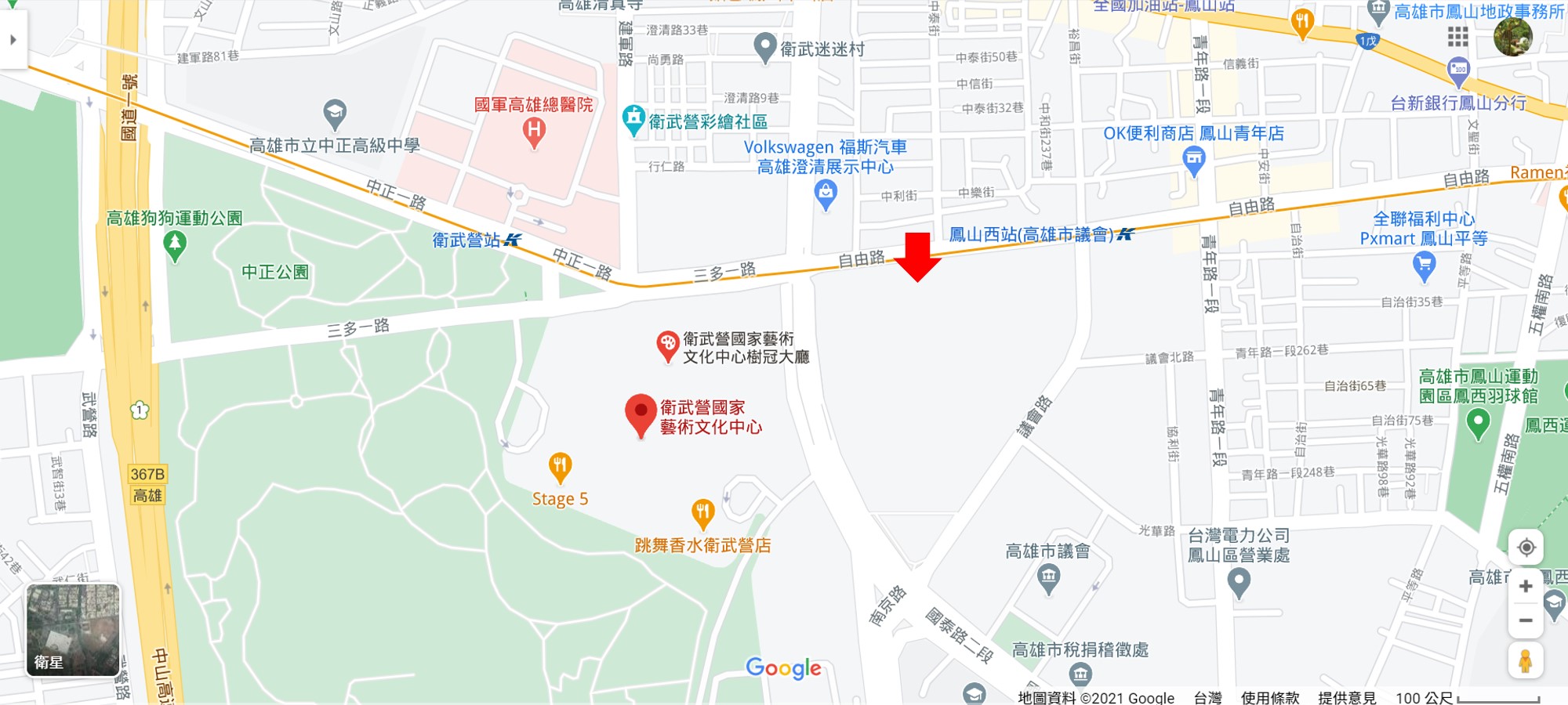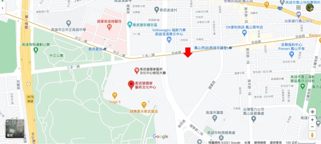 | 預定開發案位於紅箭頭指向處,對街為衛武營國家藝術文化中心 (截圖來源: Google Map) |