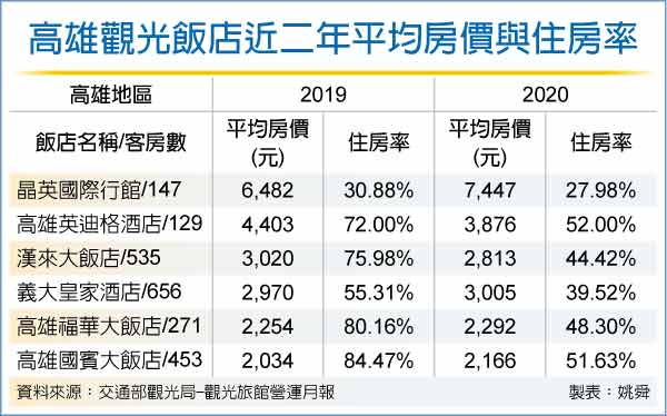 2020年受疫情影響,全年平均房價超過3,000元的高雄觀光飯店依序是晶英國際行館、英迪格酒店,以及義大皇家飯店,漢來飯店沒法躋身「三千俱樂部」。而去年高雄僅有晶英國際行館與英迪格酒店的平均客房收益超過2,000元,台灣本土晶英國際行館更以2,083元超越國際品牌高雄英迪格2,015元,其他飯店則在1,100元至1,200元間。