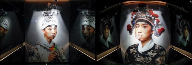 | 杭州餘杭萬麗酒店的電梯裝飾將傳統戲曲以有趣的創意來呈現 。筆者很愛這種俏皮有趣的圖片(圖左演員口塞棒棒糖,圖右演員則是口吹泡泡),雖然一開電梯門可能會把人嚇到(怎麼有巨人看著我?!),但之後會噗嗤一笑。(圖片來源: 旅遊訂房網站 ) |