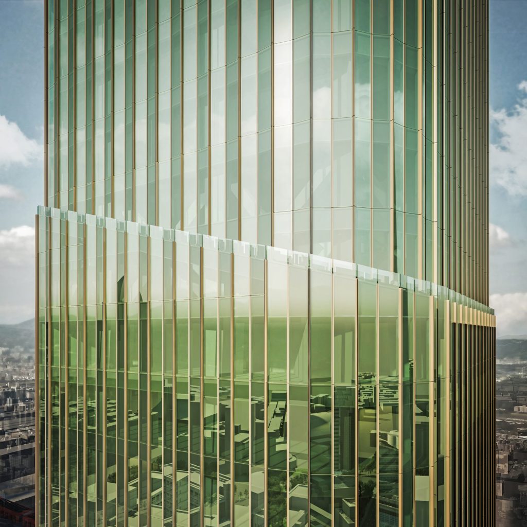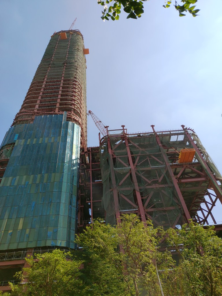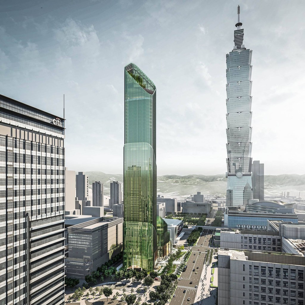 相較於台北101大樓的設計構想有部份來自於竹子的「節節高升」之意,由凱悅雙品牌酒店(台北柏悅酒店、台北安達仕酒店)所進駐的「The Sky Taipei」(台北天空塔)則是以東方文化中的竹子為設計發想主體,並融入西方文化的設計思維,就去年11月中旬現場的整體外觀來看,除了已有部份的綠色玻璃帷幕安裝上去(竹子皮),也與「成長中的竹子(摩天大樓)+竹筍(購物中心&表演中心)」意象相近,只是感覺比設計構想圖、台北101大樓來得纖細些(應與基地大小有關)。