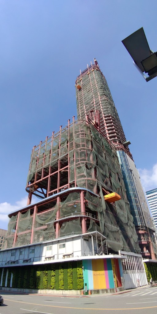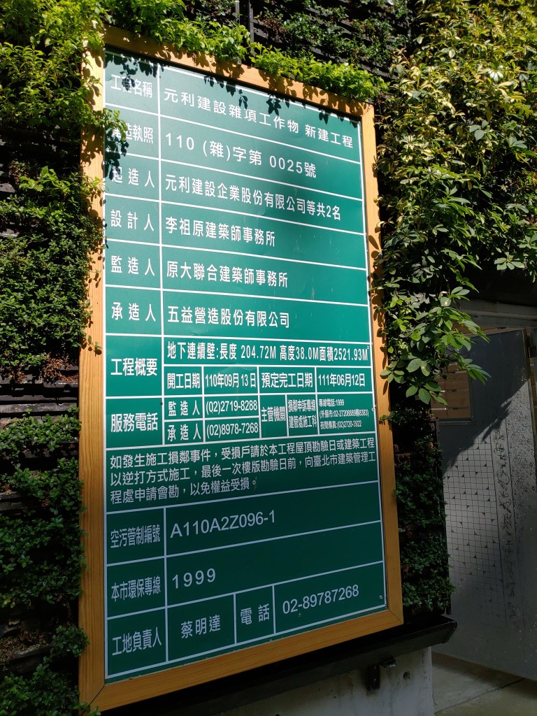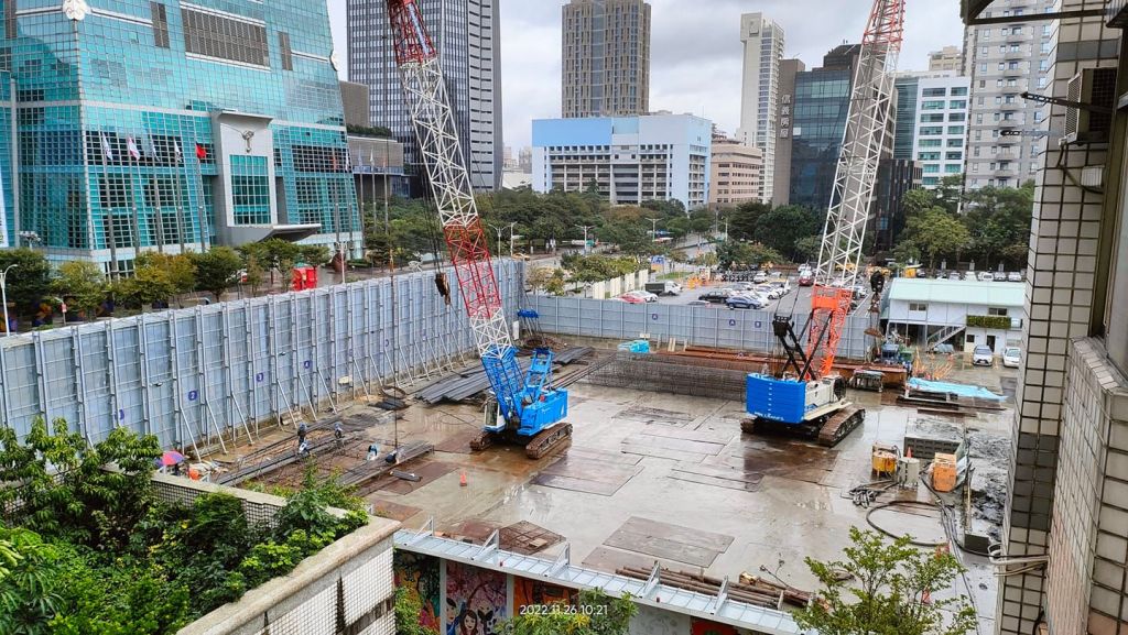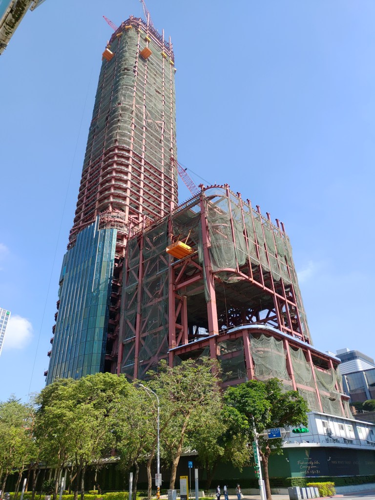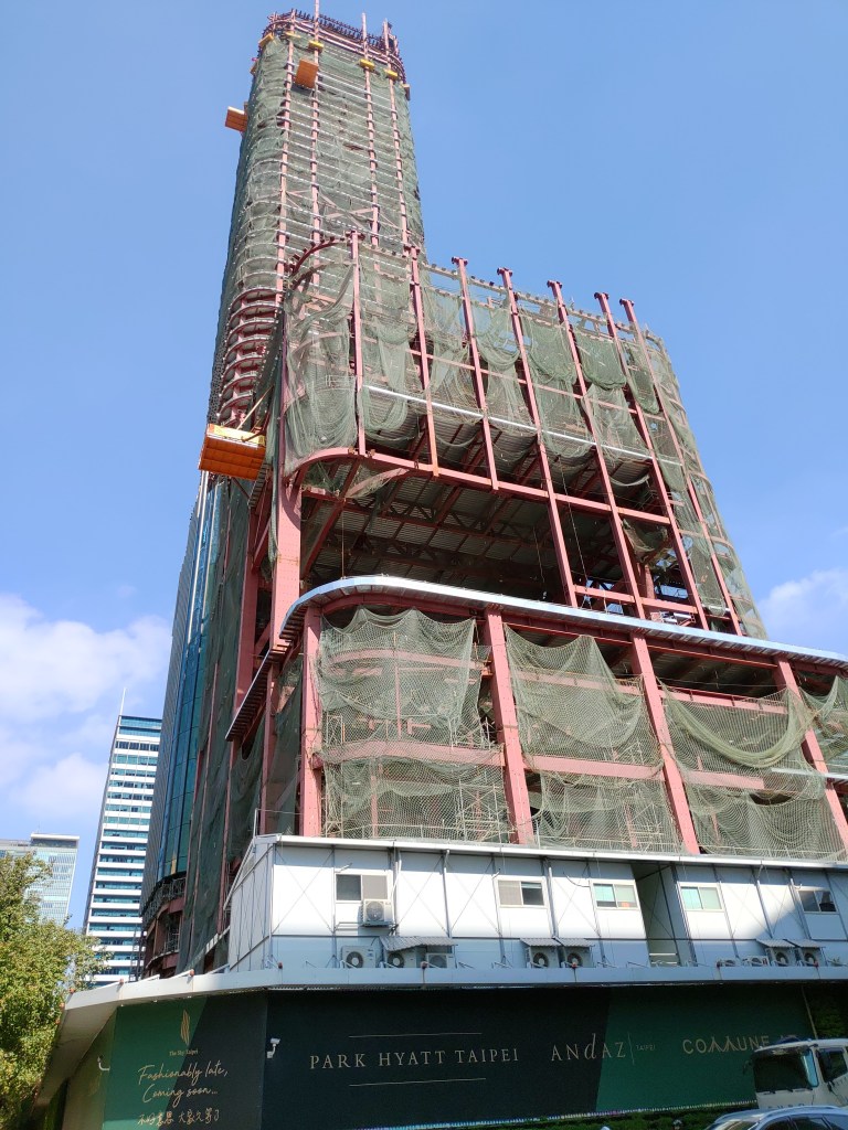 位於台北101大樓正對面的「台北四季酒店」,就2022年11月中旬所見以及工程告示牌內容,仍為「雜項工作物新建工程」,但進駐的大型吊掛重機具已由2021年的一台增為今年的三台,而圍籬的廣告宣傳呈現,又多了些業主「元利建設」的名稱在上頭,尤其是停車場側的部份。