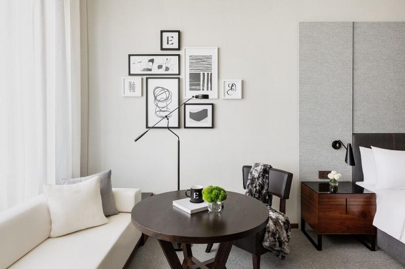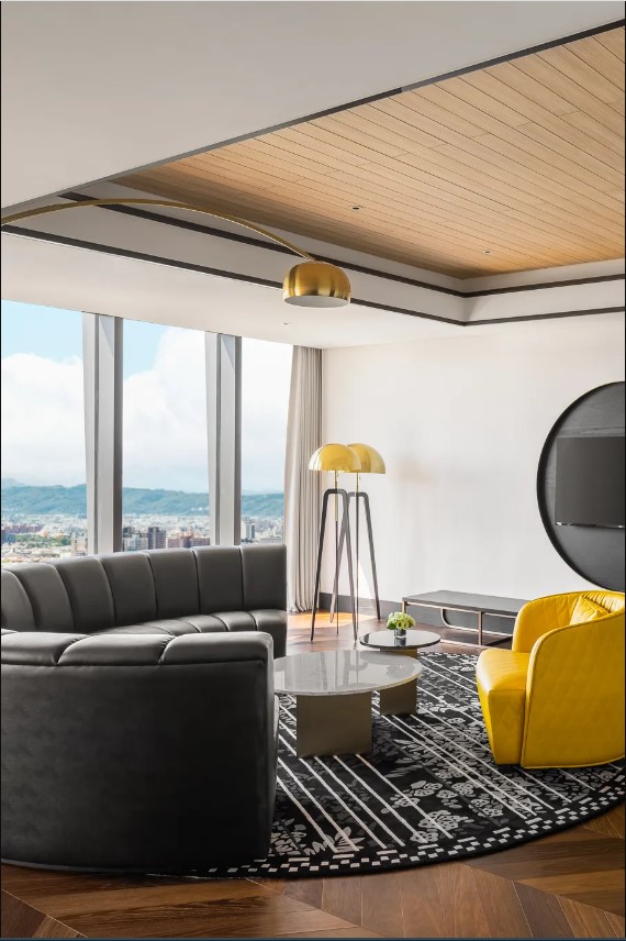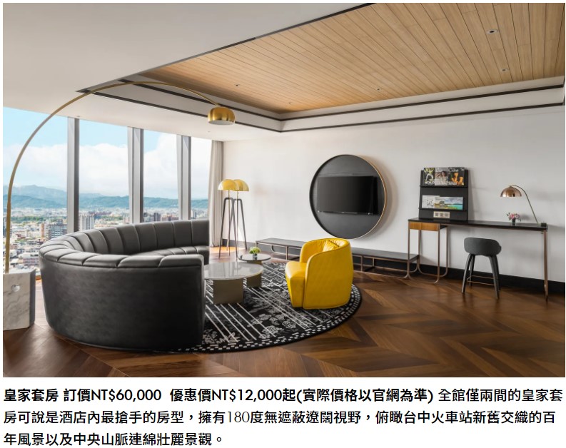 房間內延續黑、白、灰為主色調,搭配黃色沙發點綴活力感,在細節處還能見到台中元素貫穿其中,像是以台中火車站為靈感的鐵道抱枕、以及台中市花「山櫻花」圖騰的地毯等,感受到與在地的連結,而景觀的部分則是依樓層高低及面向各有不同視野感受,向東欣賞中央山脈及台中車站美景,向西可見台中市中心美麗天際線,向南欣賞鐵道延伸遼闊感。
