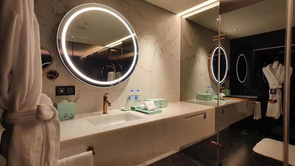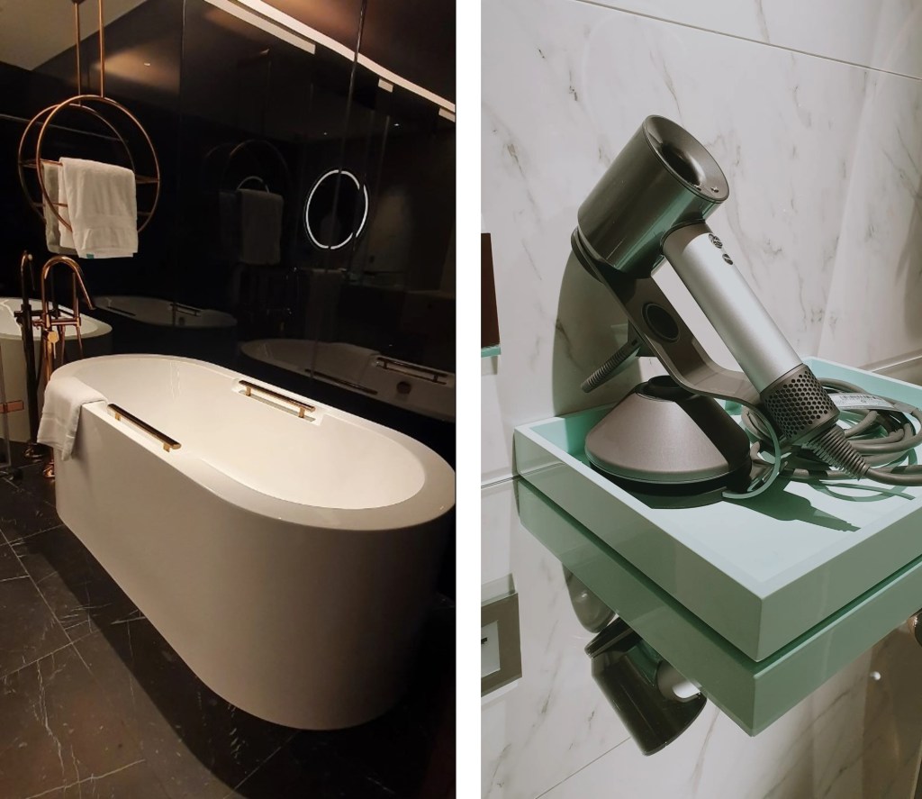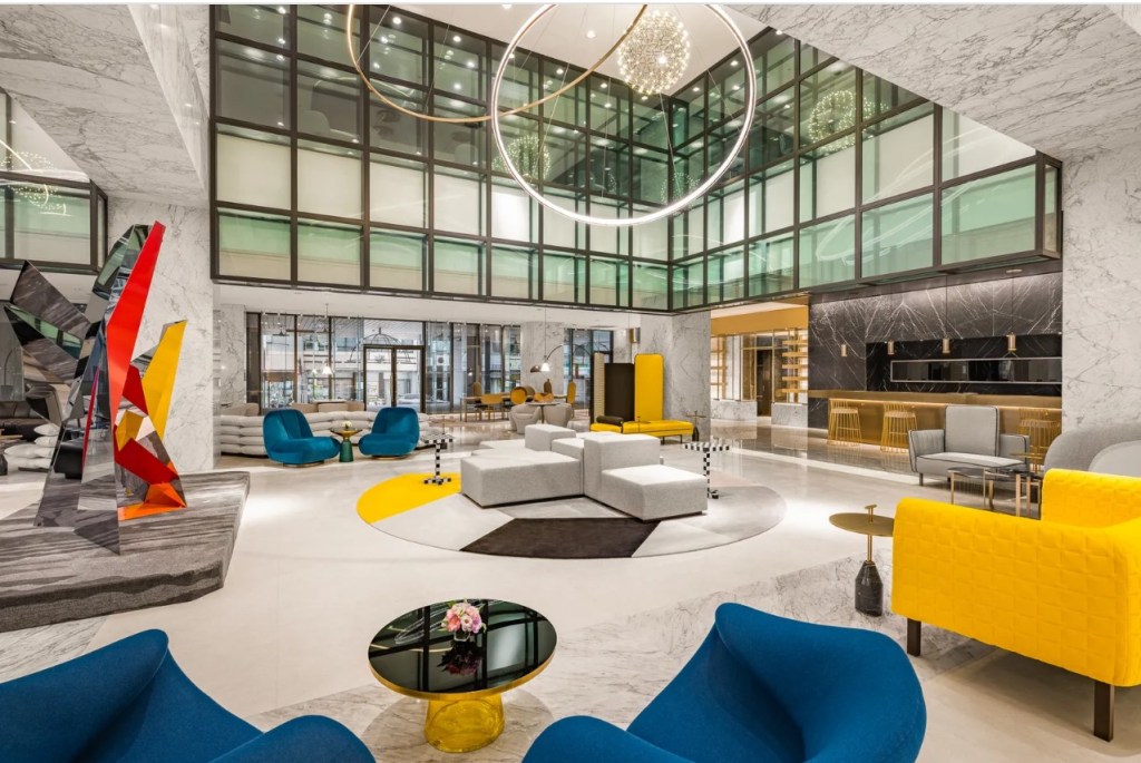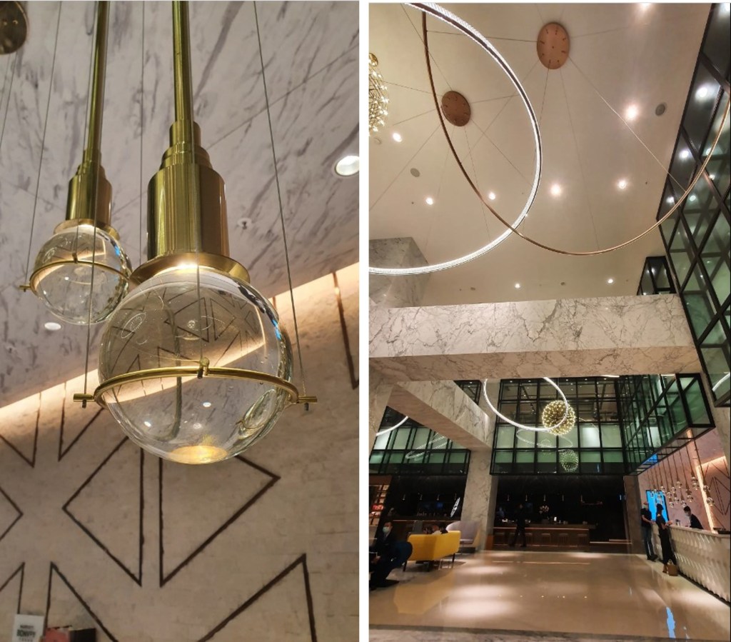 一走進大廳,大理石材加上金屬材質與飽和色彩的家具,表現出品牌都會摩登的調性,延伸自酒店圓弧外觀的設計風格靈感,結合東方哲學"圓滿"思維,內部裝飾大量選用「圓形」的傢飾、傢俱佈置,從大廳的吊燈、手工訂製半圓形沙發,到客房號碼飾版、床頭燈等,在各個空間皆可發現圓形意象。