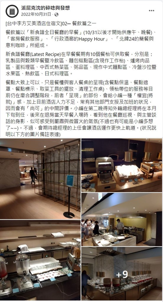 台中李方艾美酒店在過去的場勘文中,曾是每年造訪的地點之一,但由於業主方的狀況而在2020、2021年的場勘系列文中排除。不過,經2022年6月的新聞報導披露後,台中李方艾美酒店以敗部復活之姿再度回歸到台灣市場,並在同年8月29日開幕試營運(就管理團隊來說,當時的「一軍」已不復存在,而2022年所召募的「二軍」則較為倉促成軍),不過當時三樓「樂美中餐廳」、頂樓露天泳池尚未開放,二樓「新食譜餐廳」只供應早餐,館內午、晚餐暫時以一樓的「北緯24度」大廳酒吧提供簡餐服務。