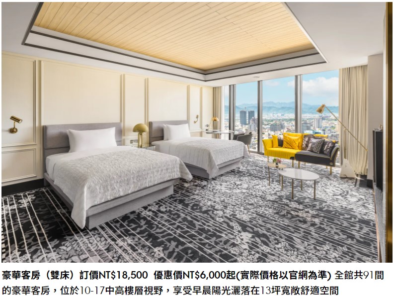 為了慶祝試營運,台中李方艾美酒店在8/24-8/26期間推出首波快閃優惠活動,預訂8/29-9/29平日(周日至周四)住房的旅客,可享經典客房雙人入住不含早超低優惠價NT$4,999,可任選一大床或兩中床房型搶先體驗,限電話訂房。