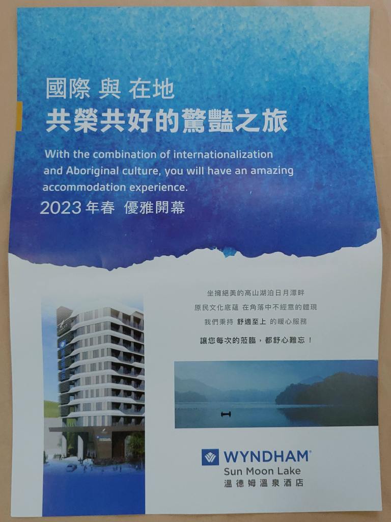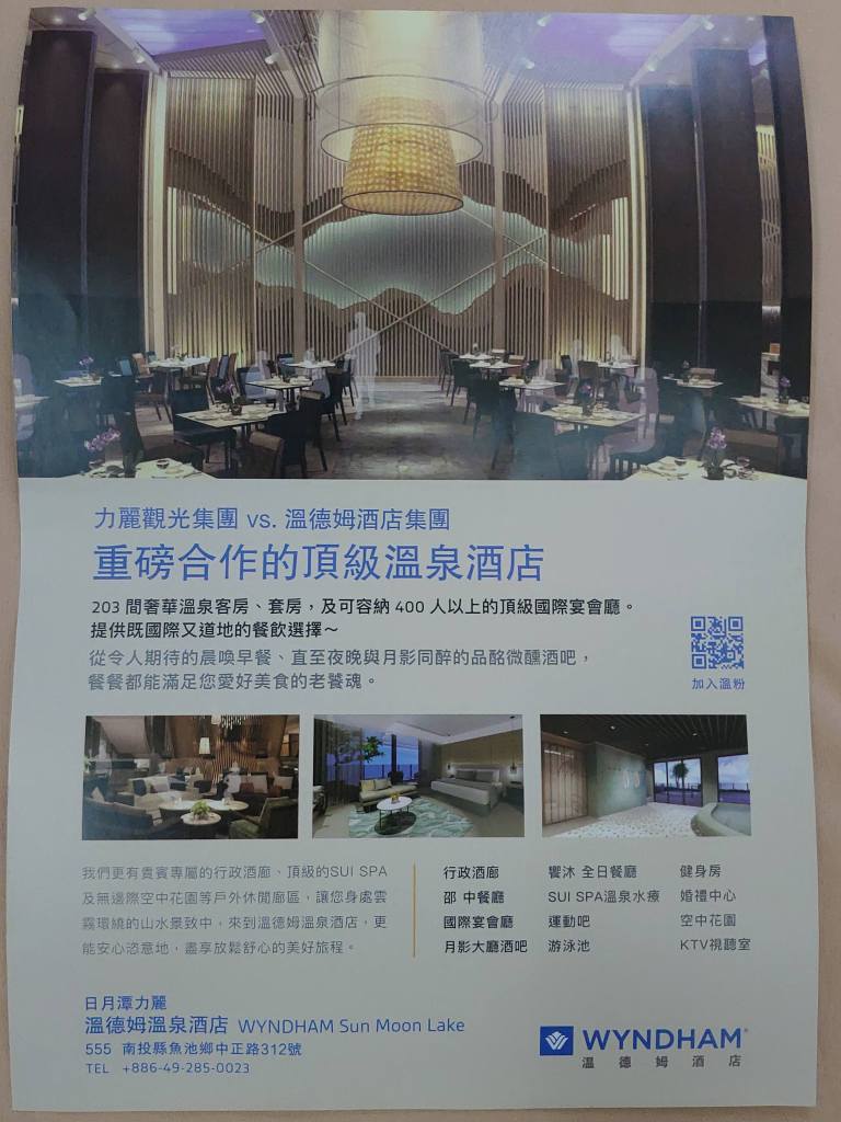 日月潭力麗溫德姆溫泉酒店(Wyndham Sun Moon Lake)的預定開幕日期在早先的新聞報導中為「2022年第三季」,隨著時間的推移,延後至2023年春季(見下方文宣的內容或此新聞連結)。以目前公開的規劃資訊,作為溫德姆酒店集團的「高端(級)酒店品牌」(premium或upscale,見網頁下方的品牌表),地上12層及地下3層的日月潭力麗溫德姆溫泉酒店有203間客房,餐飲服務計有「饗沐」全日餐廳、「邵」中餐廳、「月影」大廳酒吧、行政酒廊(「運動吧」可能也是,而客房餐飲暫未知),休閒設施則有健身房、游泳池、Sui SPA溫泉水療、空中花園、KTV視聽室、兒童遊戲室等休閒設施,至於婚宴會議服務則包含可容納近400人的國際宴會廳(多功能宴會空間)、婚禮中心。