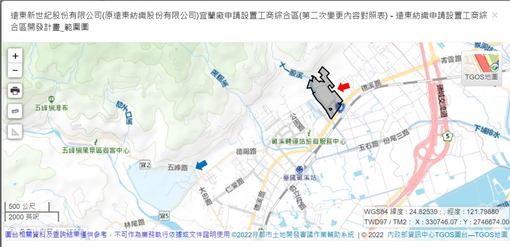 至於先前提過的遠東工商綜合區在此次(2022年11月)查看後,再與場勘後所見的資訊進行比對,發覺應該位於反方向的位置(即礁溪轉運站附近),而非當時查看的礁溪休閒渡假市地重劃區內(五峰旗山腳下,即使有看到舊廠房),於是另以位置圖補充(參見下方地圖紅色指標處)。在2023年第一季路過該址時,仍維持閒置舊廠區的外觀。