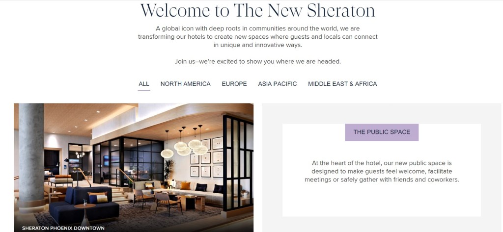 由於前喜達屋酒店集團在被萬豪集團併購前並未繳出「改造喜來登酒店」的作品,只是流於「放話」階段,因而不少國際同業都「等著看」(看笑話?)後繼的萬豪集團會怎麼「動刀改造」。承繼喜來登酒店原本的「世界的聚會處所/相聚一刻喜來登」品牌精神加上考量「現今消費者的工作與生活的習慣與偏好」,萬豪集團推出的新喜來登酒店(The New Sheraton)讓不少美國本土的酒店業主感到滿意,並認同改裝翻新的必要性,同時萬豪集團以美國鳳凰城喜來登酒店(Sheraton Phoenix Downtown)作為首間「依據新品牌規範所打造(改裝)」的樣版酒店,並逐步推展至全球各地的新舊據點,而亞太區首間喜來登新概念酒店則是位在中國四川省綿陽縣的仙海水利風景區之綿陽首開喜來登酒店(Sheraton Mianyang)。
