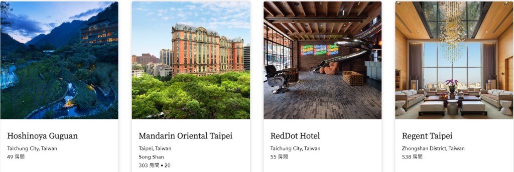 至於本園地所偏重的國際連鎖酒店,在2023年台灣米其林指南的16家推薦飯店名單中,有10間為國際連鎖酒店,而第11間國際連鎖品牌酒店則是正規劃加入「希爾頓格芮酒店(Curio Collection by Hilton)」的台北艾麗酒店。2020年以前的台灣米其林指南曾有明確公佈台灣旅館評比的名單,並標註「紅與黑的房屋數」以做為相對於「餐廳店家的星等」之高低位階,而今年(2023年)則是純粹以「台灣米其林指南推薦飯店」的方式呈現,一種「一視同仁」的感覺。其實在2021、2022年在米其林官方網站上就以如此形式上架,但由於當時相關官方新聞稿未特別提及(2023年才有),因而筆者也沒有特別列出,或許之後就以當年米其林指南公佈日為基準點,該日期之後所見的飯店名單就是當年的推薦名單,或可為便宜之計。(→只是,2023/8/31~ 9/1查看的結果與9/2所見不同,或許是因為沒更新的關係,呵呵~)