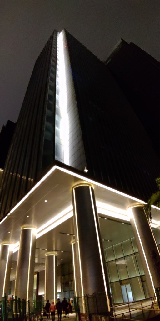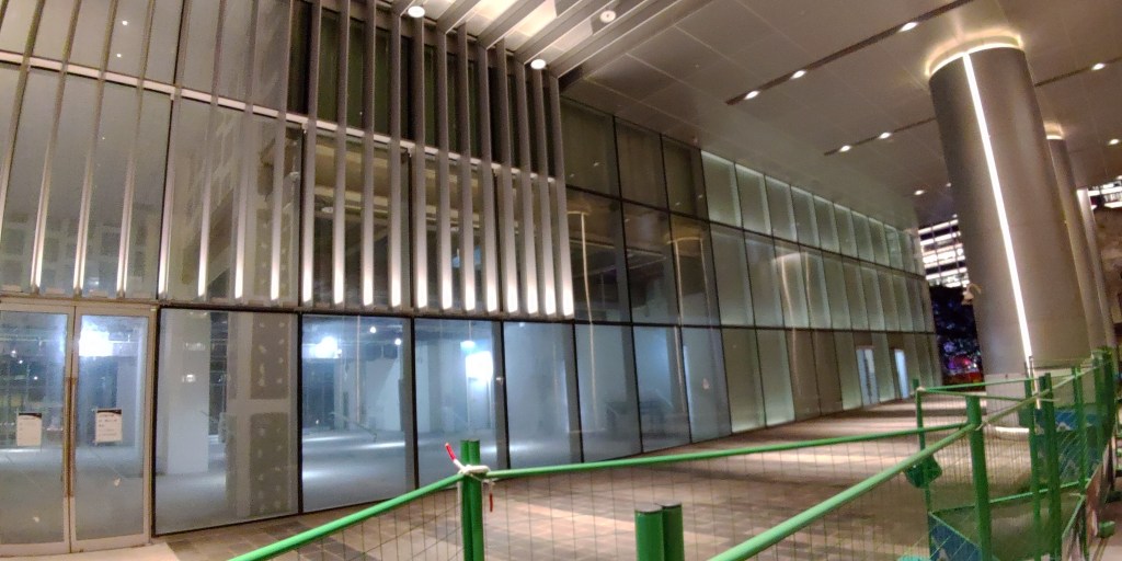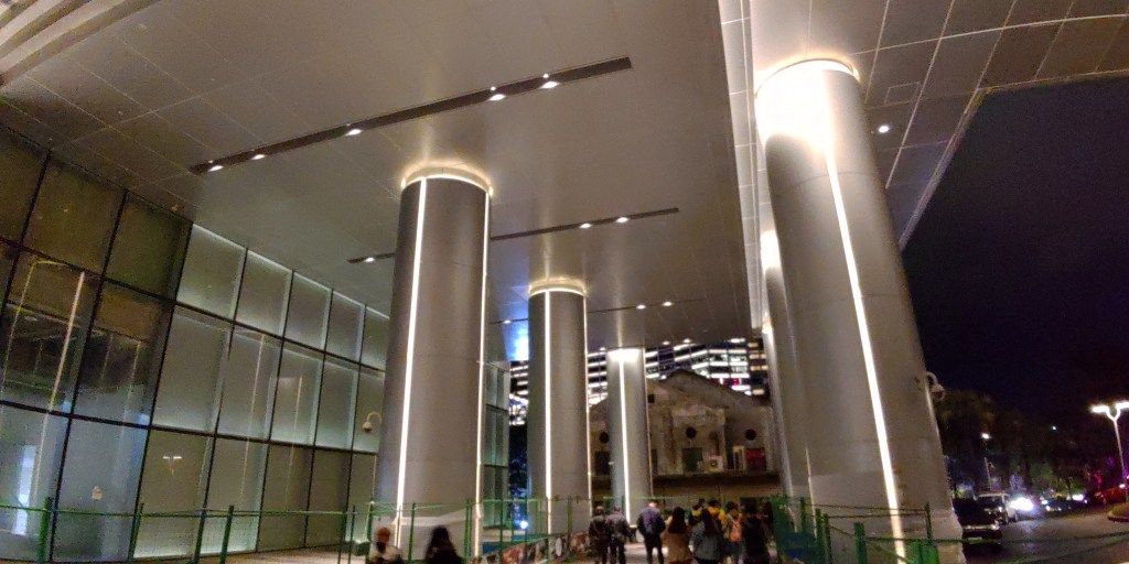 就2023年2月及10月25日所見,前者在燈會參觀路線上,除了可見挑高氣派的銀色霧面大圓柱,酒店一樓仍處於毛胚屋、尚未裝潢的狀態;而在10月下旬所見,由於工地現場恢復區隔、防護的圍籬狀態,只能在外圍瞧瞧,變動看似不大。不過,應該不久的將來,台北洲際酒店的相關設計構想圖會在少數媒體與官方平台先行揭露,如同高雄與台中的據點一樣。