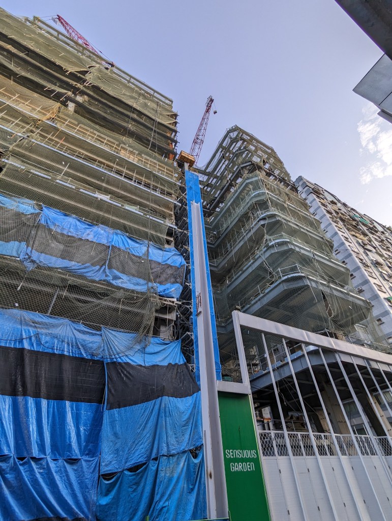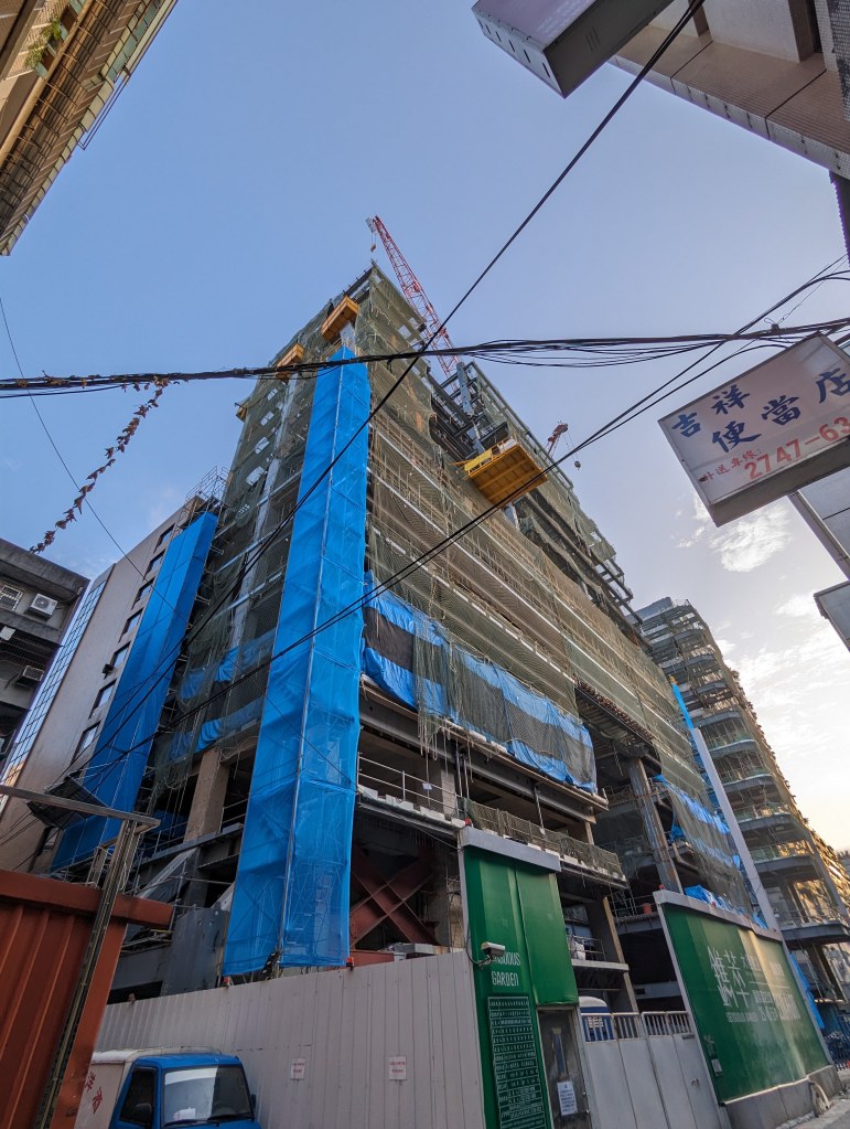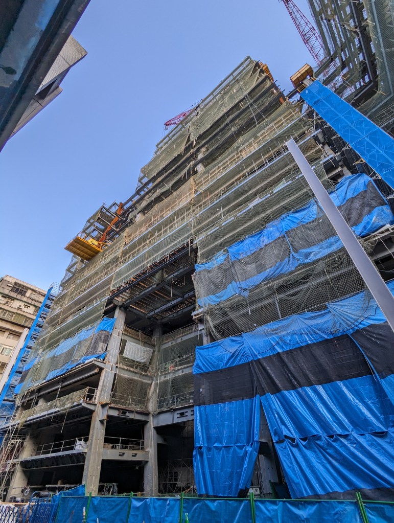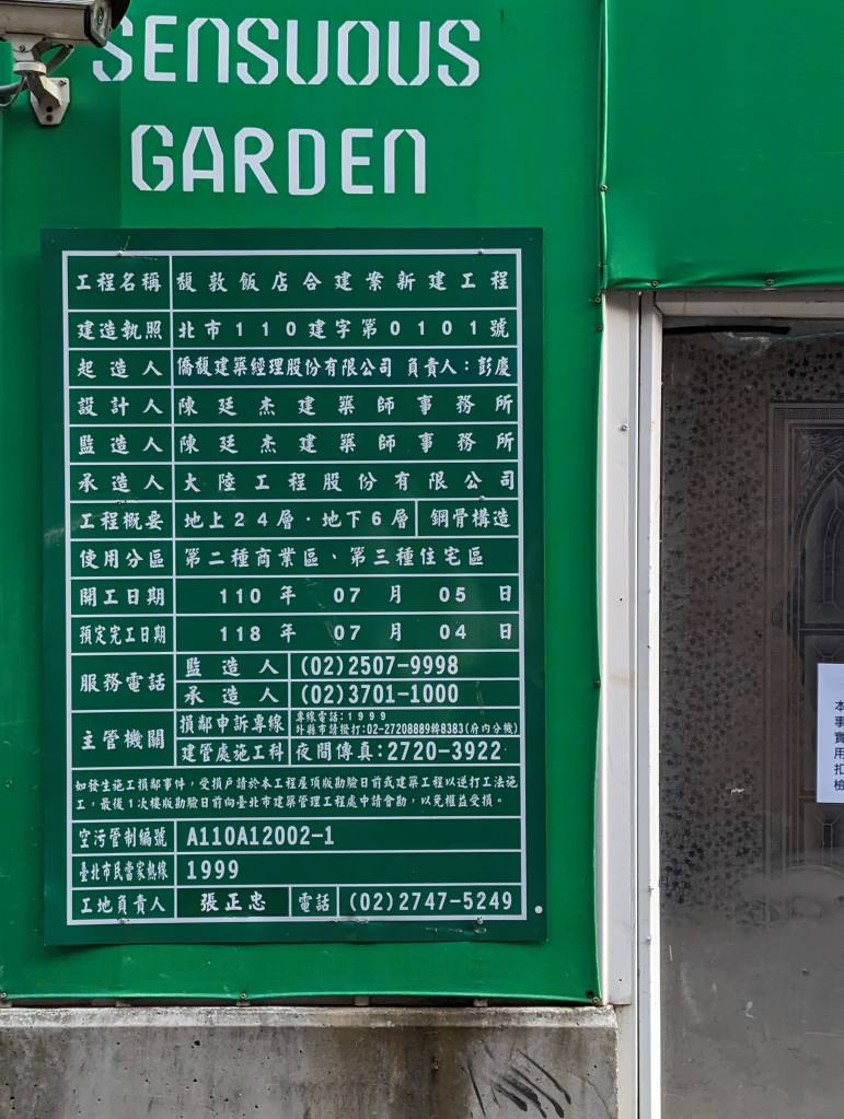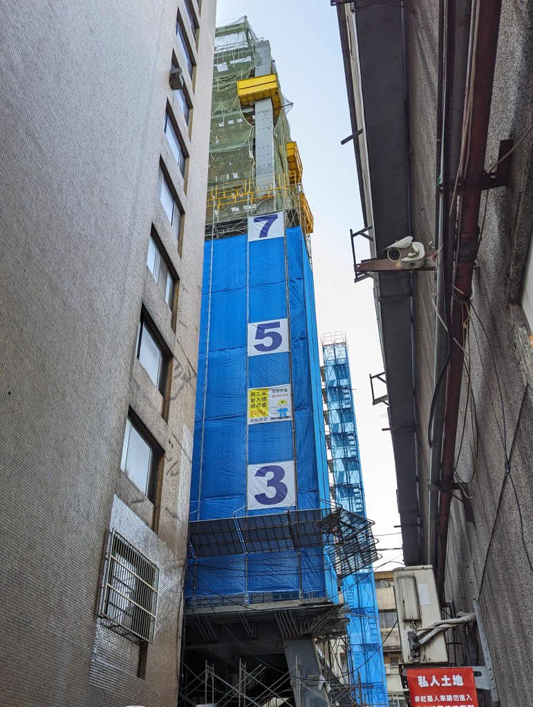 就10/25現場所見,直向(垂直南京東路)的酒店棟已搭建至10樓左右,橫向(平行南京東路)的住宅棟約莫在11~12樓左右,並持續興建中。工程告示牌所公告的完工期(興建期限)雖然是2029年7月,但預估不會這麼久,以「3~4年蓋好蓋滿」的前提下,時間點會落在2026~2027年左右。