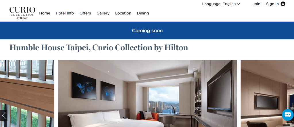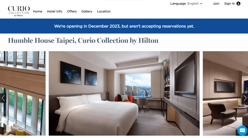 今年6月中旬,寒舍艾麗酒店經新聞媒體披露將規劃成為希爾頓集團的格芮精選酒店(Curio Collection by Hilton)成員,在當時所述內容中,僅見「今年7月1日先將名稱由『寒舍艾麗酒店』更名為『台北艾麗酒店』,俟一切符合希爾頓品牌規範後即正式對接」,而在10月25日現場查看時,除了「台北艾麗酒店 (Humble House Taipei)」之名可見,尚未有Curio Collection by Hilton的小牌子。不過,在11月上旬時,台北艾麗酒店已正式上架於希爾頓集團官方平台,包含網站與手機App,而在官方網站上,還特別標明「預計2023年12月開幕,目前不接受任何(來自希爾頓官方平台)的訂房」,12月上旬撰寫本文則見到「即將開幕(coming soon)」字樣。究竟台北艾麗酒店何時會如同台北時代寓所一樣地掛上軟性品牌的標誌,並可以在希爾頓官方平台訂房?不妨觀察看看。
