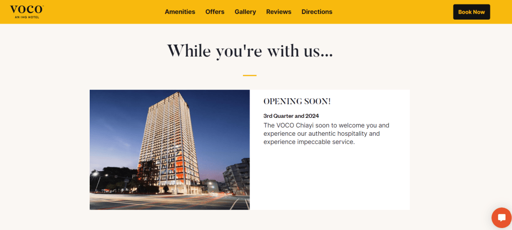 到了2023年12月下旬,嘉義福容沃科酒店(voco Chaiyi)已經在洲際集團官方平台上架。依12月27日的官網所見(見上方圖片),酒店預計的開幕時程落在2024年第3季,屆時嘉義會有三個不同風格與定位的洲際集團品牌酒店一起營運,為當地帶來不同的地景風貌,同時旅客也可以依自己的需求,入住不同的旅館據點。