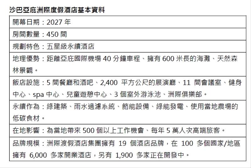 根據信義房屋資料,沙巴亞庇洲際度假酒店總投資額為10億元馬來幣(約67.7億元新台幣),規畫450間客房、5間餐廳和酒吧,以及長達6百公尺的私人海灘及天然森林景觀,2027年正式營運,將是全沙巴最貴的飯店,可望創造5百個當地就業機會。