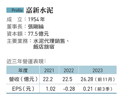 攤開財報,2023年前11月,嘉泥累積營收26.28億元,比2022年同期成長近3成,其中24%來自旅宿事業的貢獻;前三季EPS(每股稅後純益)雖然只有0.21元,但也終於終結因為疫情衝擊,而導致連續3年旅宿事業虧損的窘況。