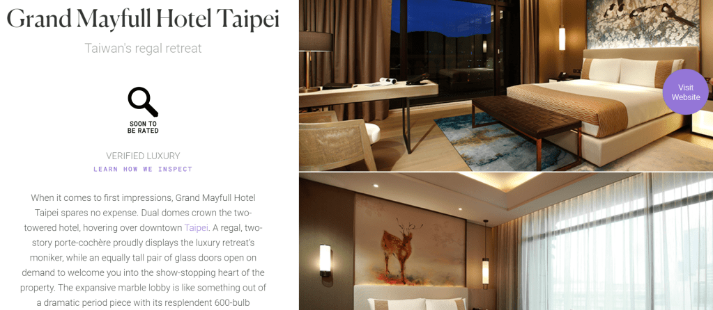 2024年2月7日富比士旅遊指南公佈了2004年全球奢華酒店榜單,其中台北市8間旅館酒店的評比外加1間看似已評鑑但待確認等級的「卓越五星國際觀光旅館」(見下方圖片,截圖時間2024/ 04/10),其中四星奢華酒店有台北文華東方酒店、台北萬豪酒店、台北W酒店及台北晶華酒店,推薦奢華酒店有誠品行旅、台北君悅酒店、台北艾麗酒店及台北遠東香格里拉大飯店,至於台北美福大飯店則是即將公佈評鑑結果的對象。台北美福大飯店的出線結果其實會有一種「師夷之長技以制夷」的「味道」,實因台灣的專責單位都已仿傚美國汽車協會評比與富比士旅遊指南的評鑑標準而且還多生出一個「卓越五星」的等級,但在美國的企業機構之評比結果會是如何,就拭目以待。不過,「夷」字涉及貶低之意,但原出處是如此。