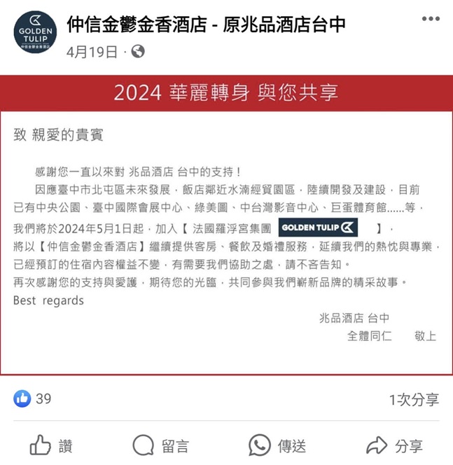 在今年3月時,筆者其實有看到「台中將有第二間金鬱金香酒店」的新聞報導,除了內心「蛤~~」了一聲之外,其實也等著這類「待驗證」的消息正式浮出水面。後來在昨日(5/1)經網友在臉書專頁的留言提醒,台中兆品酒店業經新聞媒體披露正式換牌成為台中仲信金鬱金香酒店,而業者其實早在今年4月19日已藉由官方臉書專頁公告。金鬱金香酒店集團在台據點已由去年的6個據點再增為今年的7個據點,目前位居國際連鎖酒店集團在台市場的老四之位,而老大至老五則分別為萬豪集團、洲際酒店集團、凱悅酒店集團及希爾頓酒店集團。