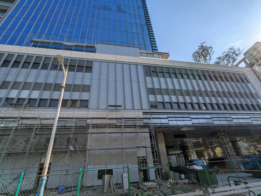 關於全台第4間的艾美酒店─ 台北板橋艾美酒店,在2024年的11月社團聚會曾經再度聊到它的存在,「到底有沒有在動工?工程是停了嗎?」是參與聚會者的疑問,筆者則是以2024年稍早的幾次路過所見反饋說「仍有在進行」。就2024年11月30日所見,美美的酒店標誌已掛上頂樓,只是換了個方向,與先前公佈的設計構想圖有90度角的不同,而地面層的酒店大門雨遮也可看到酒店標誌。工地現場除了地面層正在進行花園(公園)區植栽工程的前期作業外,酒店暨辦公大樓也有工程人員進進出出,推測正在進內裝工程,而一樓已有部份封上落地窗或玻璃帷幕。推估酒店樓層完工大約在2026年,至於開幕營運日,若以先前網友在臉書專頁留言區所分享的表單內容,品牌管理方「理想的」預計開幕期程落在2026年5月。