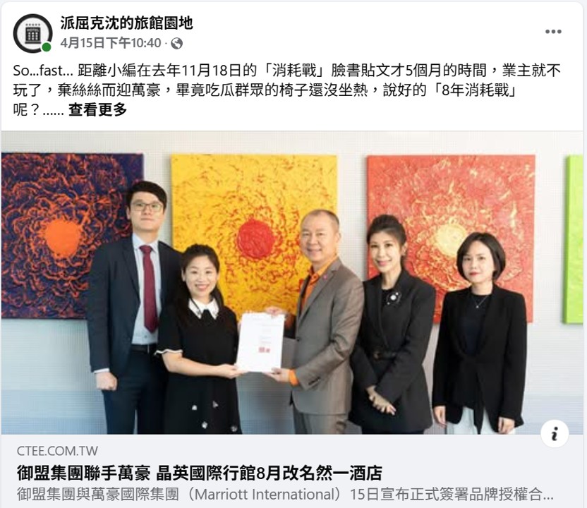 P: 嘿咩,就是要看這種旅館開發合作案的戲碼才夠味!不過,這事距離去年11月18日的「消耗戰」臉書貼文才5個月的時間,業主就不玩了,棄絲絲而迎萬豪,剩下的「8年消耗戰」應該會改以「合約糾紛」的戲碼「未完待續」。