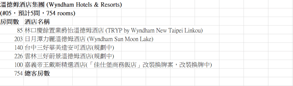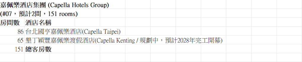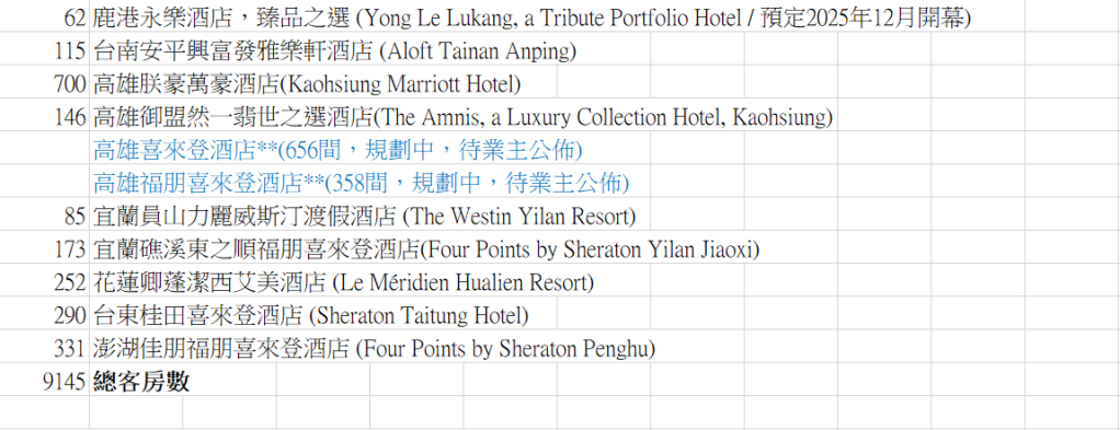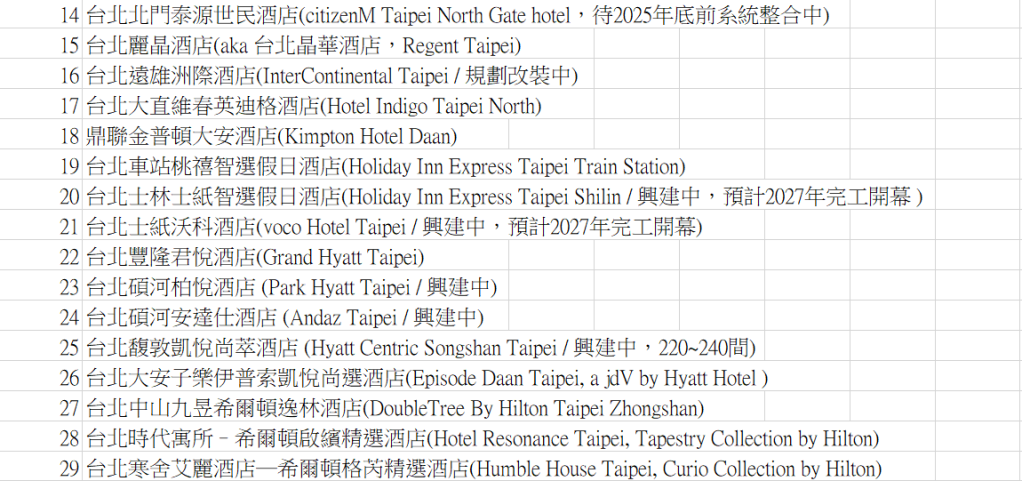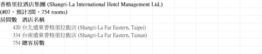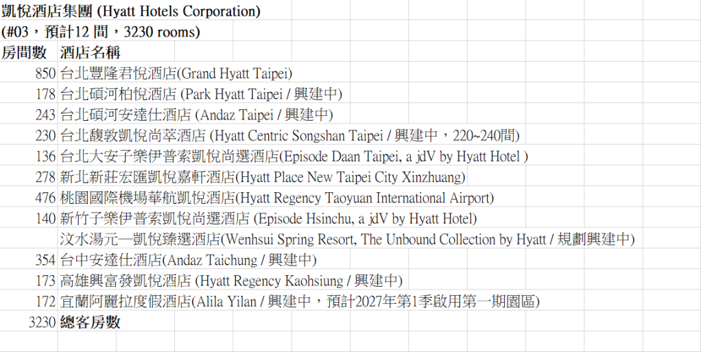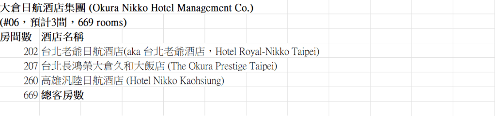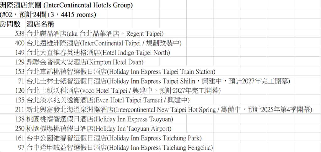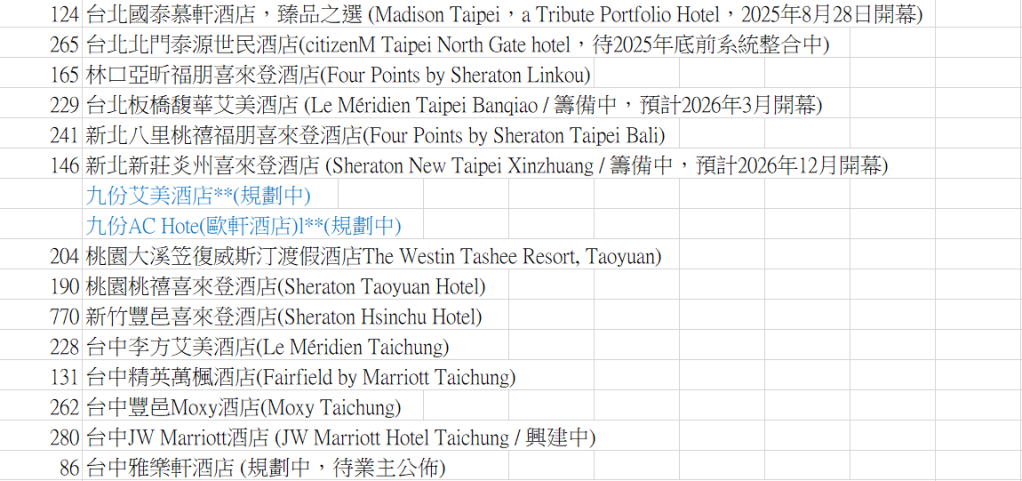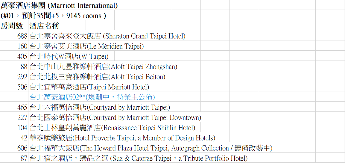筆者在今年懶人包的內文形式嘗試做了調整,以圖片匯整的方式代替先前的條列式文字,雖然字體再縮小些,但版面較不易受閱讀介面所影響。同時,今年各個據點新增「房間數」欄位以了解各個國際連鎖酒店集團在台灣市場的「產能規模」,這與「台灣旅館回收大王」在《年度百大酒店集團榜單 (The List)》上榜,刺激到筆者有關(笑)。當然,缺少餐飲乃至於宴會會議的產能規模倒是有些可惜,畢竟台灣市場對於「酒店館內餐飲消費」的習慣、喜愛程度相當高,同時餐飲消費門檻往往比住宿費來得低、易達性(accessibility)高。當然,更多檯面下運作的資訊,筆者未必都能涵蓋到,有多少就儘量分享。