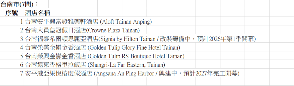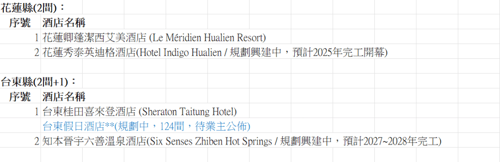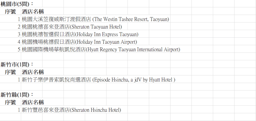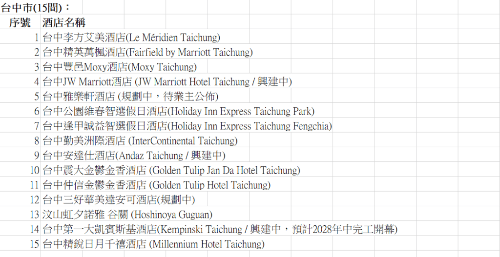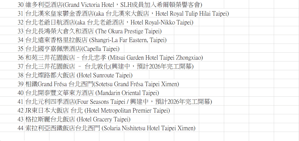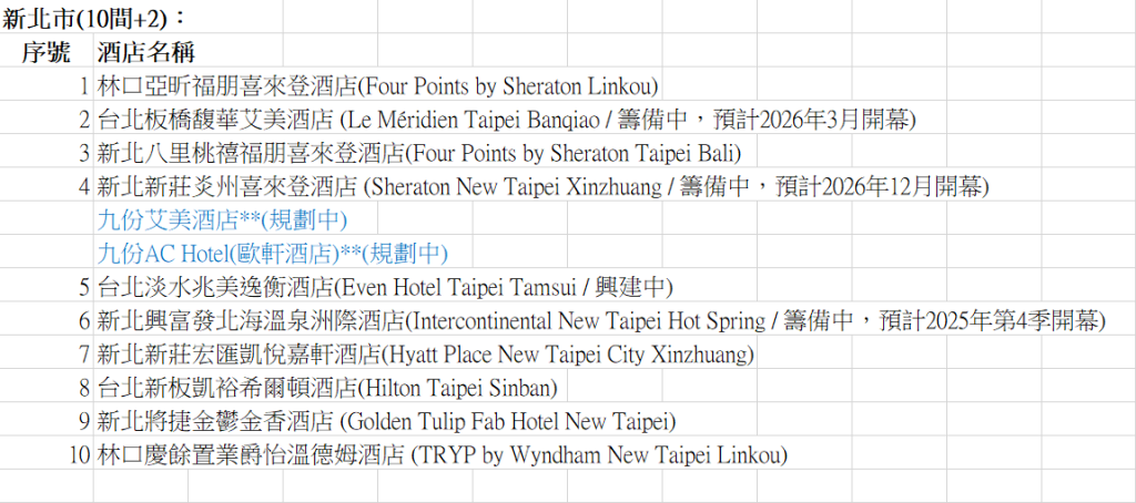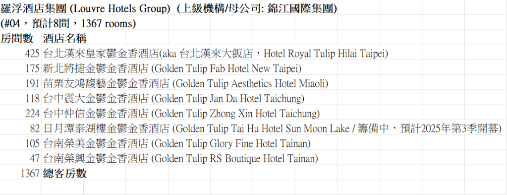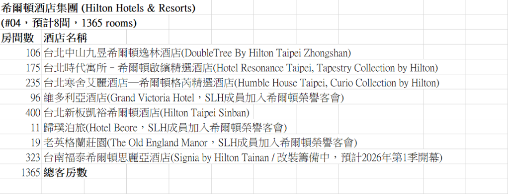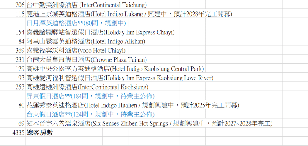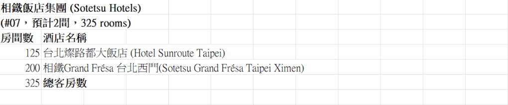 筆者在今年懶人包的內文形式嘗試做了調整,以圖片匯整的方式代替先前的條列式文字,雖然字體再縮小些,但版面較不易受閱讀介面所影響。同時,今年各個據點新增「房間數」欄位以了解各個國際連鎖酒店集團在台灣市場的「產能規模」,這與「台灣旅館回收大王」在《年度百大酒店集團榜單 (The List)》上榜,刺激到筆者有關(笑)。當然,缺少餐飲乃至於宴會會議的產能規模倒是有些可惜,畢竟台灣市場對於「酒店館內餐飲消費」的習慣、喜愛程度相當高,同時餐飲消費門檻往往比住宿費來得低、易達性(accessibility)高。當然,更多檯面下運作的資訊,筆者未必都能涵蓋到,有多少就儘量分享。