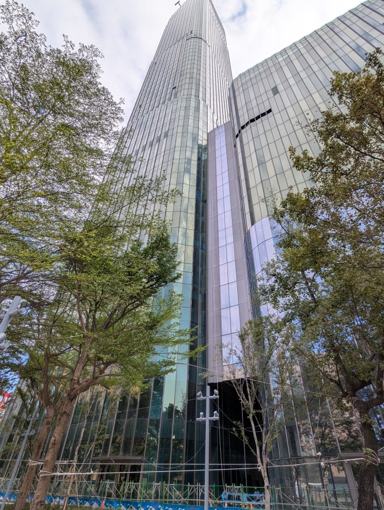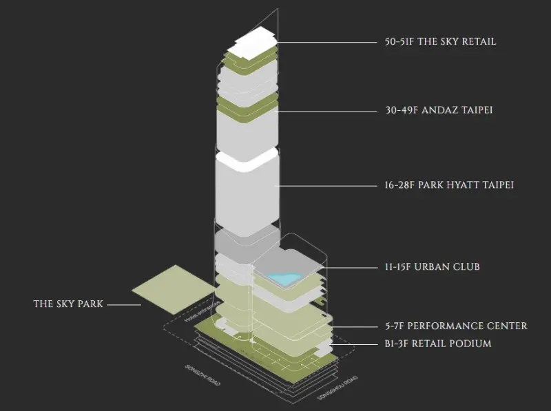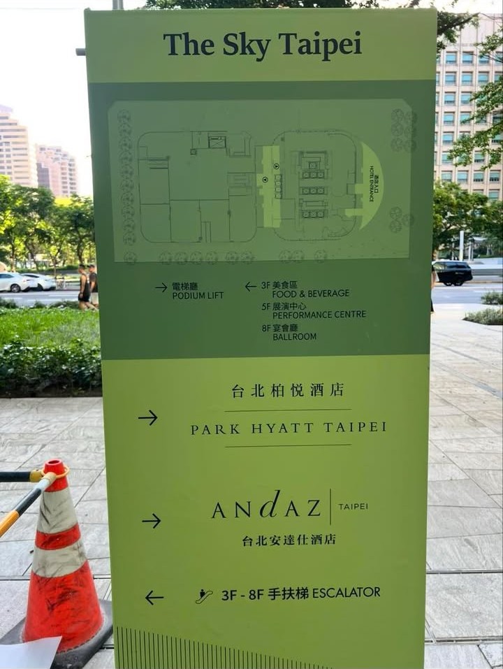 台北柏悅酒店(Park Hyatt Taipei)、台北安達仕酒店(Andaz Taipei)所進駐的台北天空塔(The Sky Taipei)於2025年11月8日的場勘所見,相較於2024年,地面層已經撤除大部份的簡化型工程圍籬與施工鷹架,僅剩酒店棟的大門區還有圍籬,呈現一種「收尾」感,這使得一般路人能更近距離觀察整個台北天空塔的外觀,包括頂樓區再度有吊掛機具在施工,至於酒店內的裝潢工程應該仍在進行中,只是實際狀況不明。