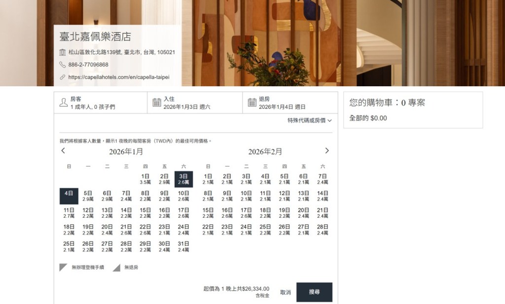 台北嘉佩樂酒店在今年(2025年)開幕初期的基本房價單晚在1萬多至2萬元台幣之譜(未計入服務費及稅),而在2026年所見的房價已是2.1萬台幣起跳的價格,直接越過台北文華東方酒店並挑戰「全台北市最高平均房價旅館」的地位。後續登場的台北四季酒店、台北柏悅酒店等奢華酒店,推測應與台北文華東方酒店在相近的價格區間,使得台北嘉佩樂酒店可望成為台北市最高房價的住宿產品。而國際評價、評比的部份,今年獲得首屆米其林星鑰酒店獎項,或許2026年也會有富比士旅遊指南4星以上的殊榮,不妨觀察一下。