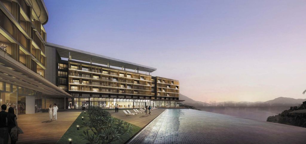 (碼頭區旁的一樓為杉餐廳,二樓為宴會廳,路面層的三樓為大廳區,四樓以上為客房樓層)