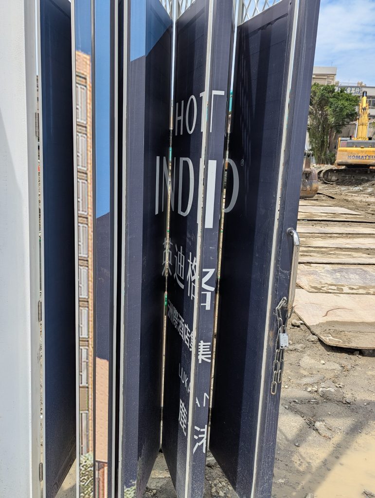 (在工程人員上班時間,這個有英迪格酒店標誌及酒店設計圖的折疊式工程圍籬門會收起來,以方便機具、人員進出,但筆者硬要拍)