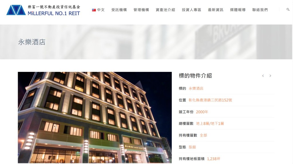附帶一提的是,在查找資料以撰寫本段落時,筆者剛好看到鹿港永樂臻品之選酒店為資本額230.8億台幣的「樂富一號不動產投資信託基金 (Millerful No.1 REIT)」的「增購投資標的」之一。同時,早在2019年7月29日,這個不動產投資信託(REITs)基金以4.15億台幣的價格從業主帝豪貿易公司的手中收購整棟酒店資產,而當時收購的著眼點在於「鄰近的彰濱工業區與鹿港觀光景點是鹿港永樂酒店廣大的客源,加上該酒店為加盟國際品牌SLH之旅館,在管理、維護與服務層面上亦有相當水準,其房價與住房率具備支撐力道,且取得後之租金收益率對提升本基金可分配收益有幫助」。